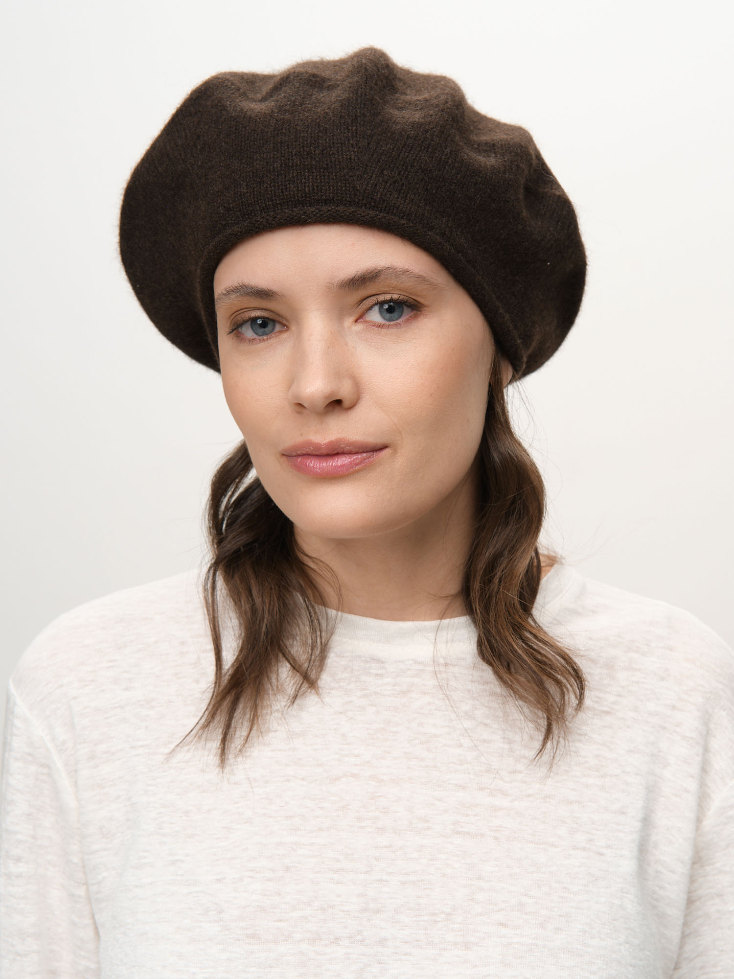 Темно-коричневый оттенок легко сочетается с базовыми цветами (черный, бежевый, серый, бордо) и добавляет образу благородство. Носите его слегка сдвинутым набок для парижского шика или ровно — для строгого стиля.