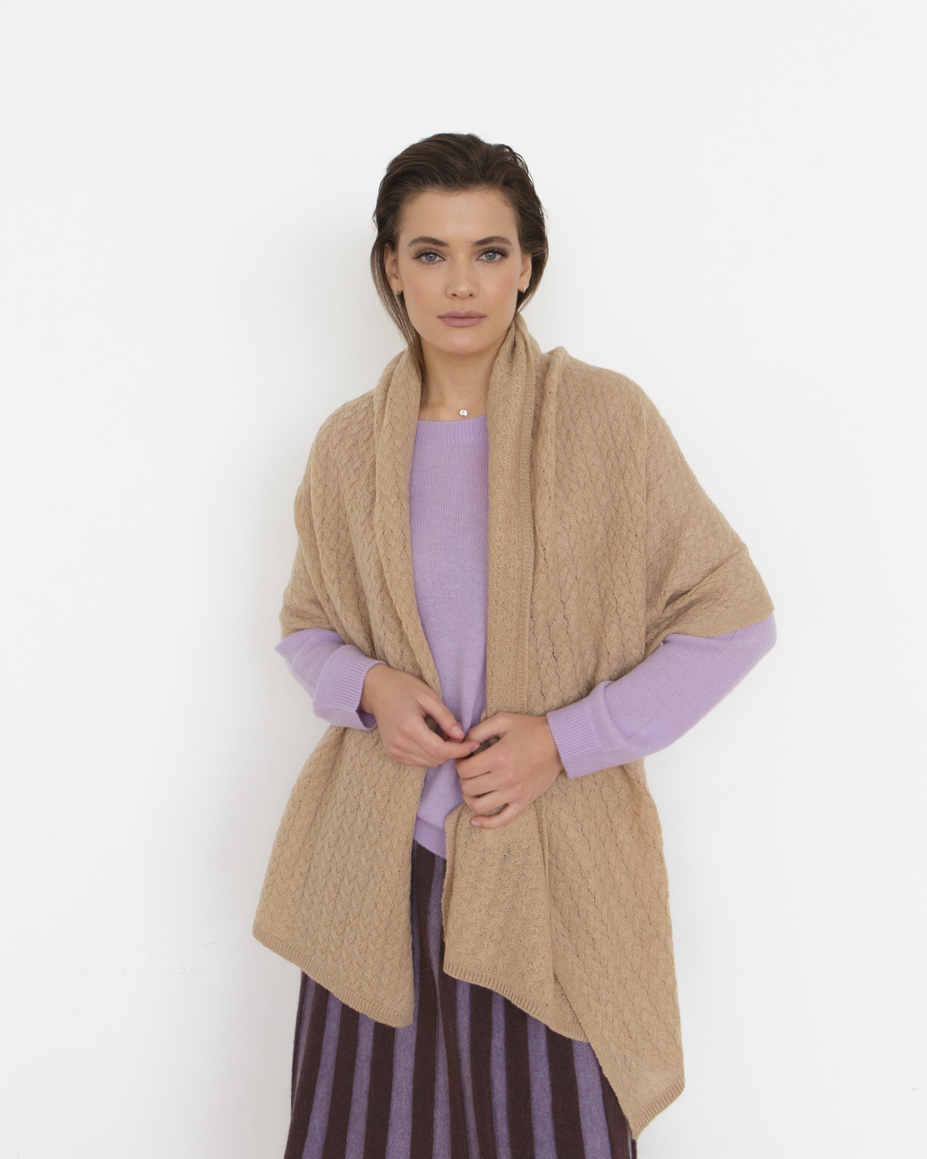 Классическая прямоугольная форма с аккуратной фактурной вязкой. Лаконичный дизайн подчеркивает натуральную красоту материала и делает палантин универсальным элементом гардероба.