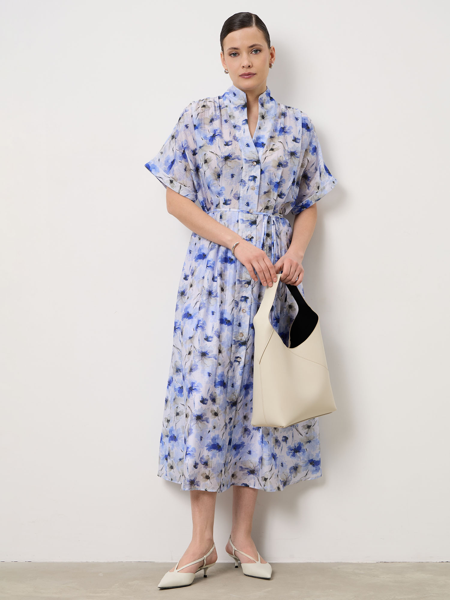 Модель выполнена с аккуратным воротником и застёжкой на пуговицы спереди. Короткие рукава и длина миди создают элегантный силуэт, а нежный цветочный принт делает образ более выразительным и женственным.
