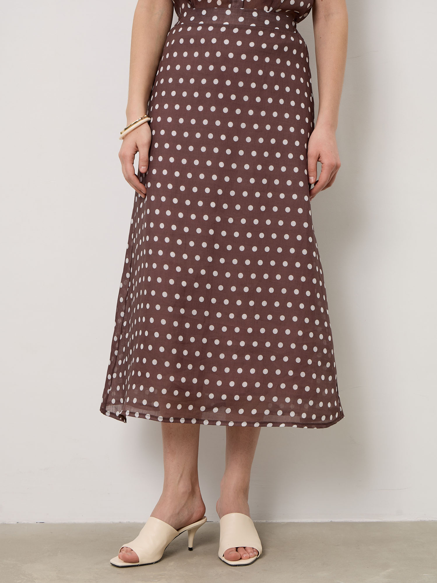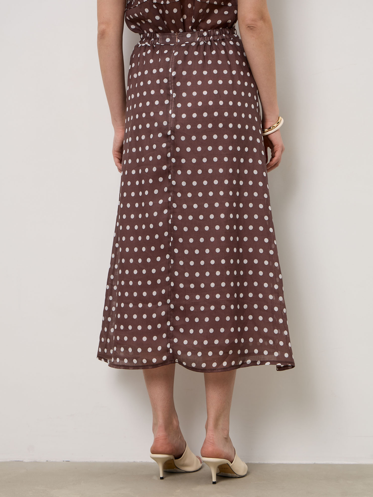 Юбка выполнена в длине миди с мягким расклёшенным силуэтом, который красиво движется при ходьбе. Классический принт в горошек придаёт модели выразительность и делает её стильным акцентом образа. Лаконичный дизайн подчёркивает натуральную фактуру ткани.