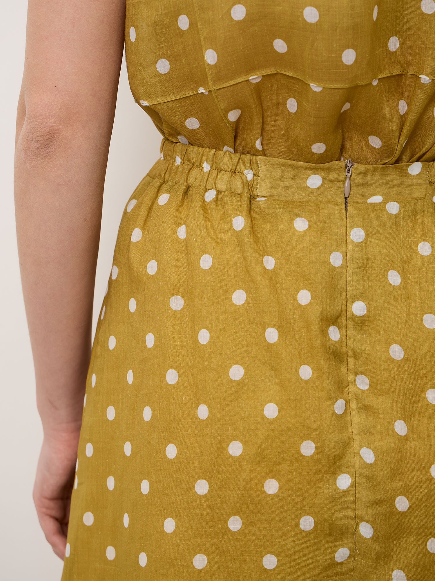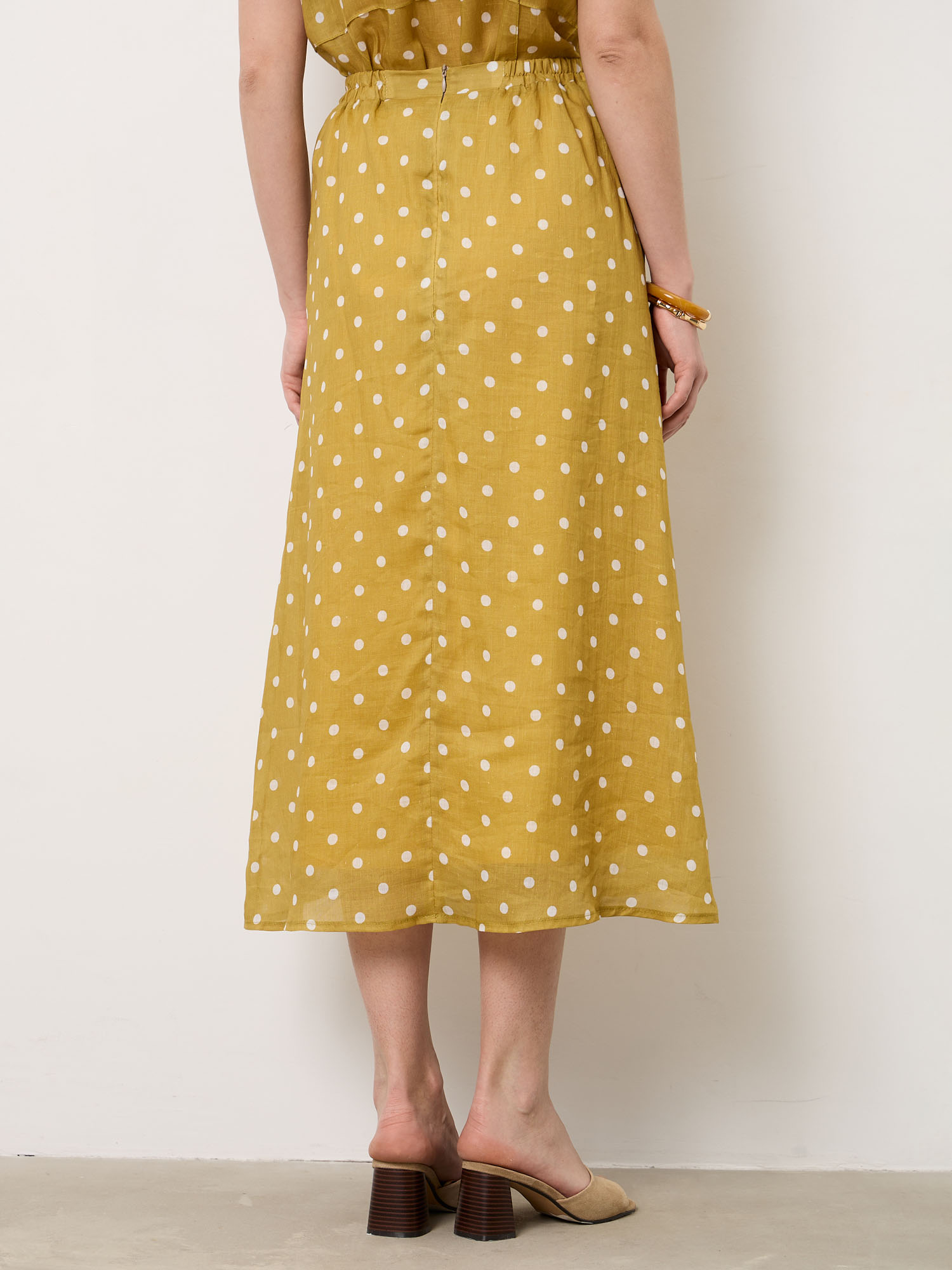 Модель выполнена в длине миди с мягким расклёшенным силуэтом, который красиво движется при ходьбе. Классический принт в горошек придаёт образу лёгкую винтажную нотку. Лаконичный крой подчёркивает натуральную фактуру ткани и делает юбку универсальной для разных образов.
