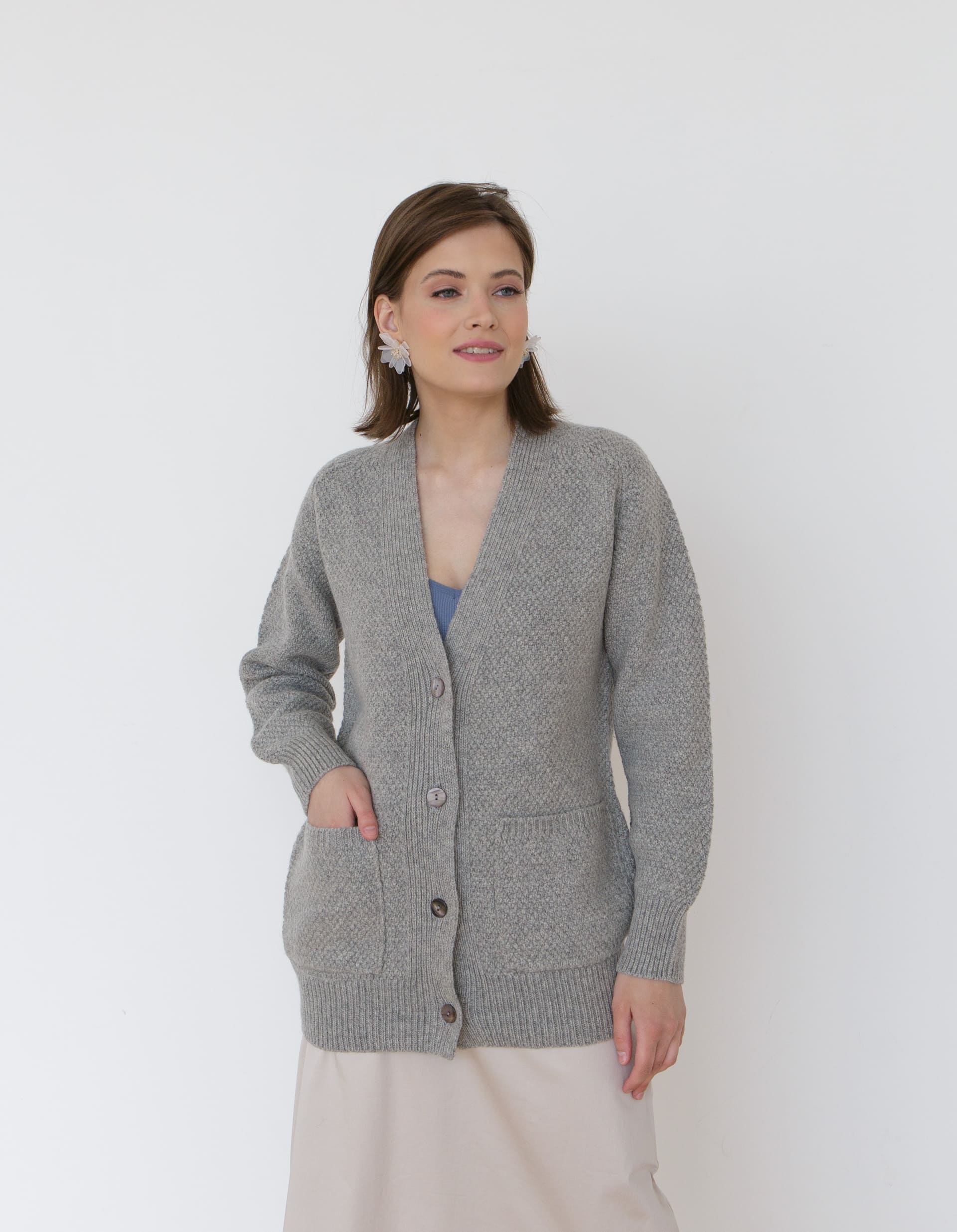 Модель выполнена в функциональном дизайне с глубокими вместительными карманами, добавляющими практичности повседневному образу. Прямой силуэт свободного кроя обеспечивает удобство движений и подходит для различных типов фигуры. Серый цвет делает кардиган универсальным базовым элементом, который легко сочетается с другими предметами гардероба независимо от их цветовой гаммы.