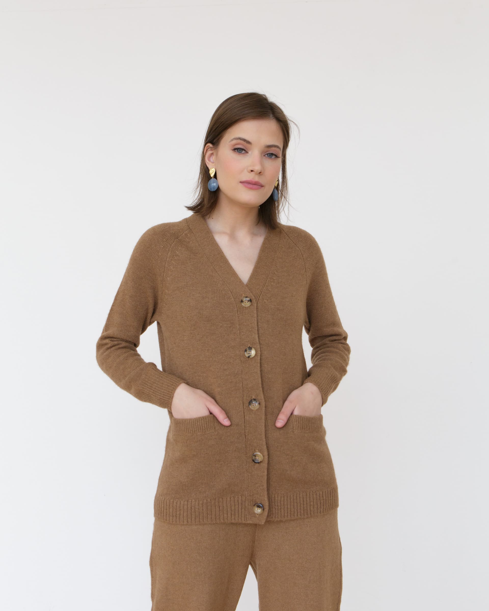 Классический удлиненный V-образный кардиган на пуговицах с внешними карманами