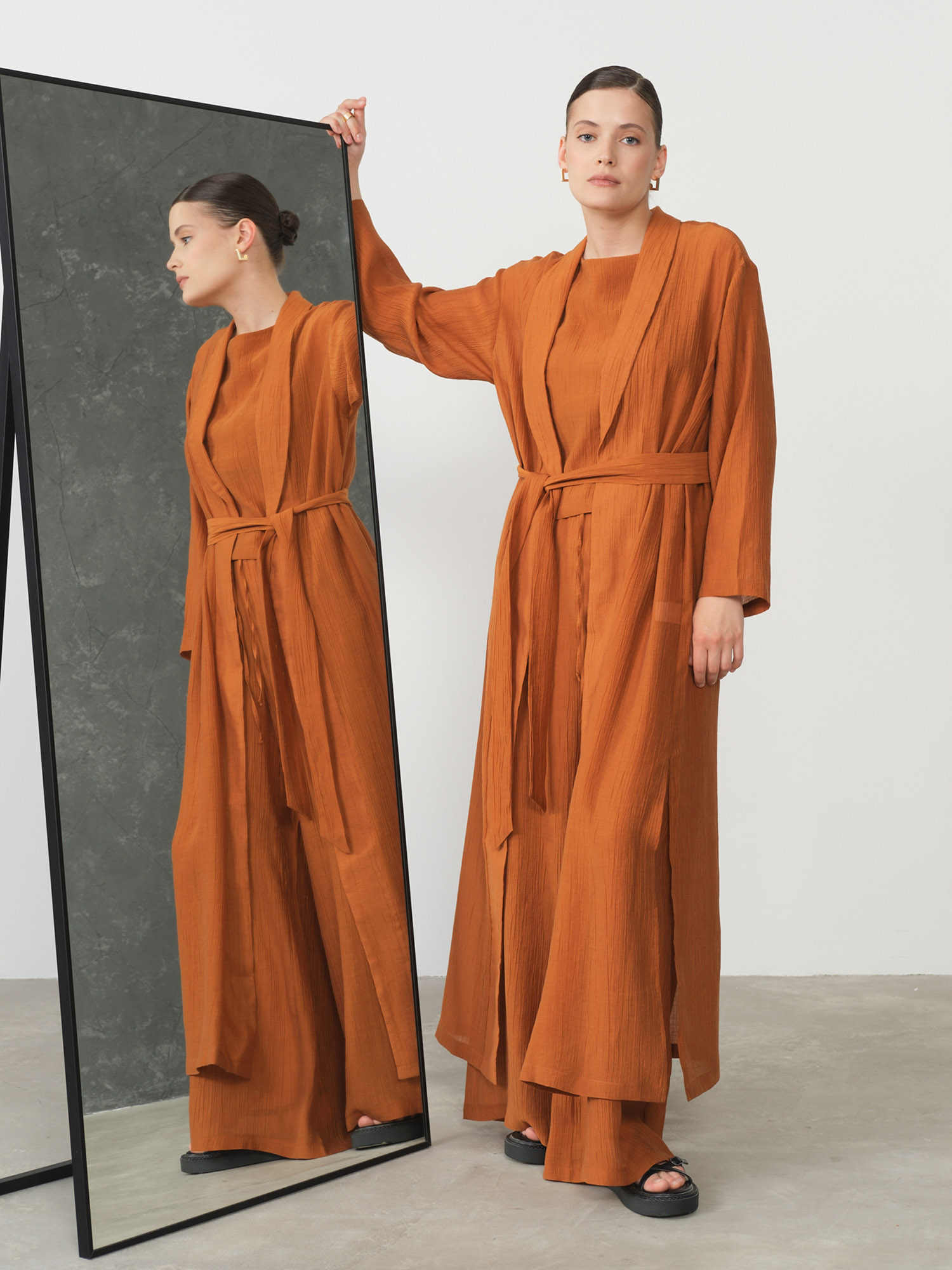 Свободный удлинённый силуэт в стиле кимоно с мягкими линиями. Отсутствие жёсткой конструкции обеспечивает лёгкость и комфорт в движении.
