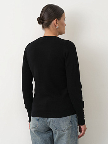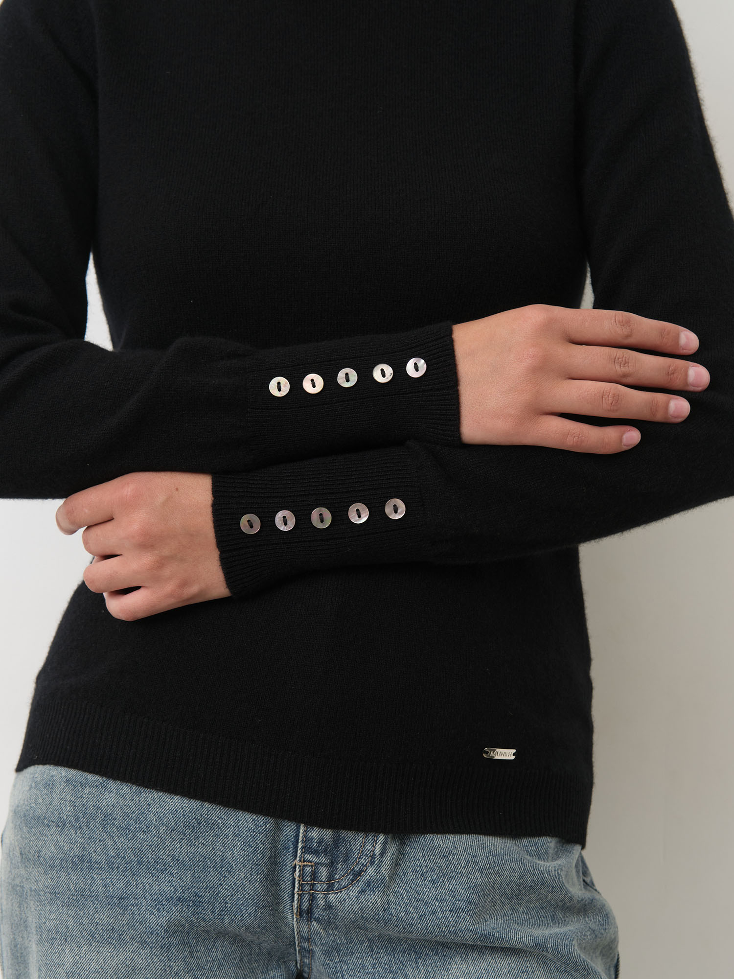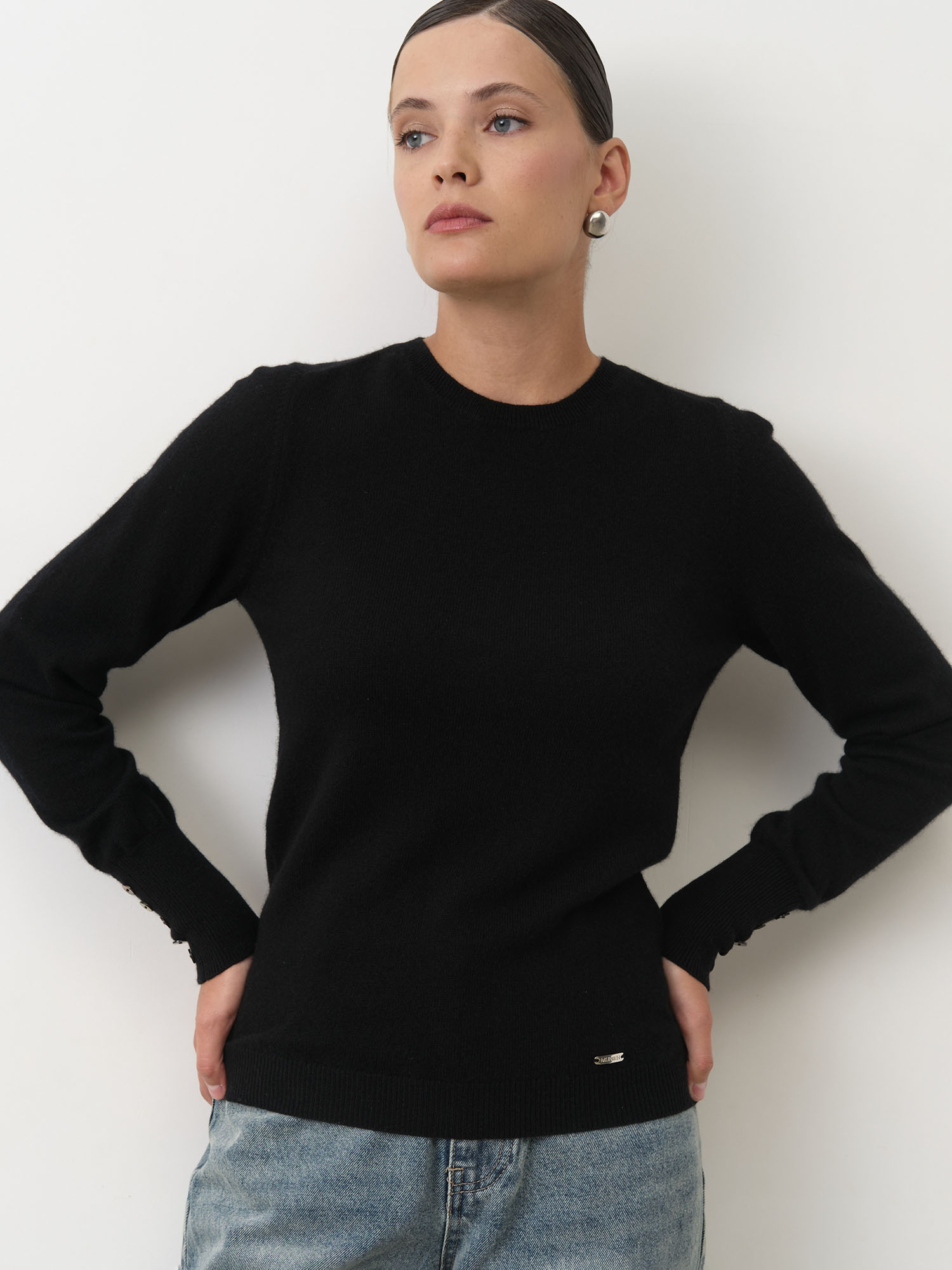 Классический кашемировый джемпер в универсальном чёрном цвете — базовый элемент гардероба, который легко адаптируется под разные стили. Модель выполнена с круглым вырезом и длинными рукавами, а изюминкой дизайна становятся декоративные пуговицы на манжетах, добавляющие элегантности. Плотная, но мягкая фактура кашемира обеспечивает комфорт и тепло, сохраняя при этом лёгкость изделия. Идеально сочетается как с джинсами в повседневных образах, так и с классическими брюками или юбками для более строгого стиля.