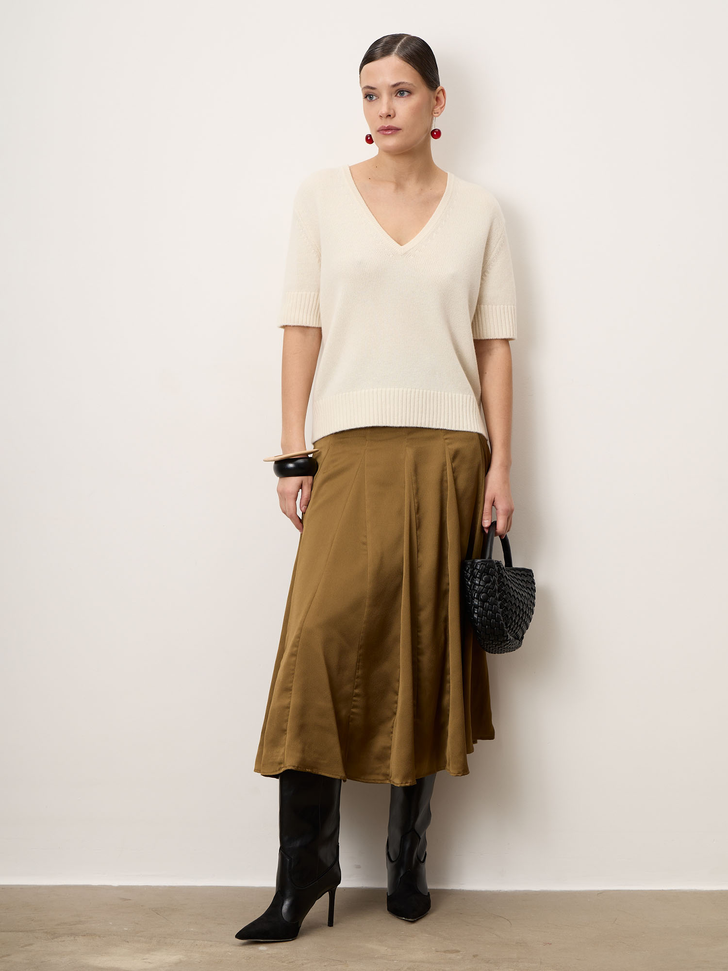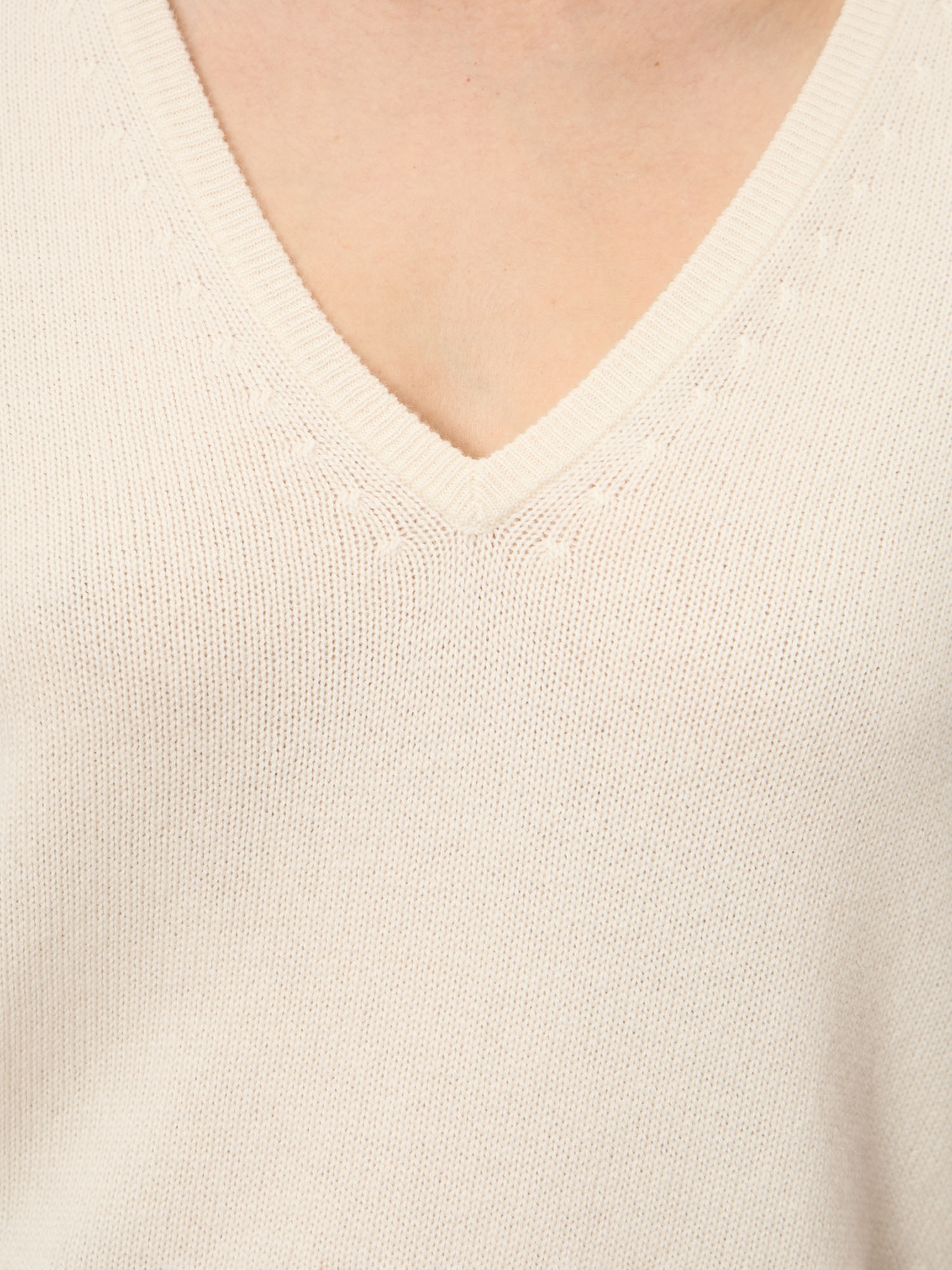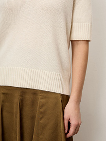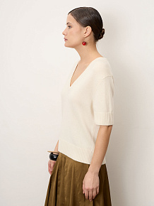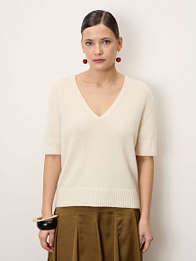 Нежный джемпер из 100% монгольского кашемира в кремовом оттенке. Мягкий, тёплый и гипоаллергенный, с женственным V-вырезом и аккуратным прямым силуэтом. Универсальная премиальная база для повседневных, офисных и элегантных образов.